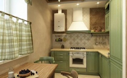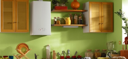 Разрабатывая дизайн кухни, следует серьезно продумать, как впишется в него новый прибор отопления. Вполне возможно подобрать такой агрегат, который по цвету совпадет с кухонным гарнитуром или же бытовой техникой. В таком случае газовый котел органично впишется в общий стиль. Установить его можно будет между кухонными шкафчиками. Этот прием разрешают не только производители отопительных приборов, но и газовые и пожарные службы.