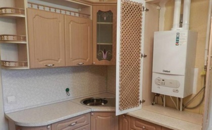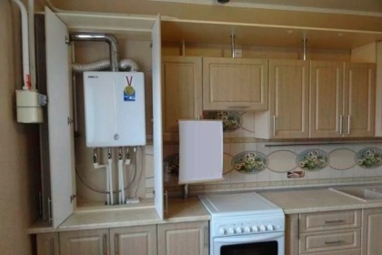 В том случае, если газовый котел будет монтироваться во внутренней части кухонного шкафа, то следует особенно тщательно следить за тем, чтобы такое оборудование располагалось на пути движения воздушных потоков в кухонном помещении. Кроме этого, при таком варианте размещения газового котла, необходимо предусмотреть наличие конвекционных отверстий и в дверцах самого кухонного шкафа, в котором будет располагаться отопительное оборудование.