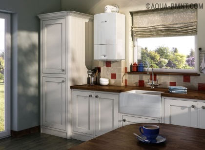 Если хозяева считают, что дизайн крышки отопительной установки не вписывается в интерьер кухни, то можно встроить агрегат в навесные шкафчики. При этом шкафчик, с установленным внутри котлом не будет отличаться от других предметов обстановки кухни.