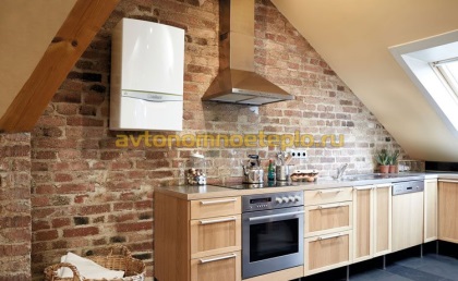 Итак, при сооружении автономной системы отопления в жилом доме, выгоднее всего расположить газовый котел на кухне. Этот агрегат можно установить открыто, так как современные модели выглядят привлекательно и интерьер комнаты не пострадает. Но можно установить агрегат и внутри шкафчика кухонного гарнитура, разумеется, позаботившись о безопасности.