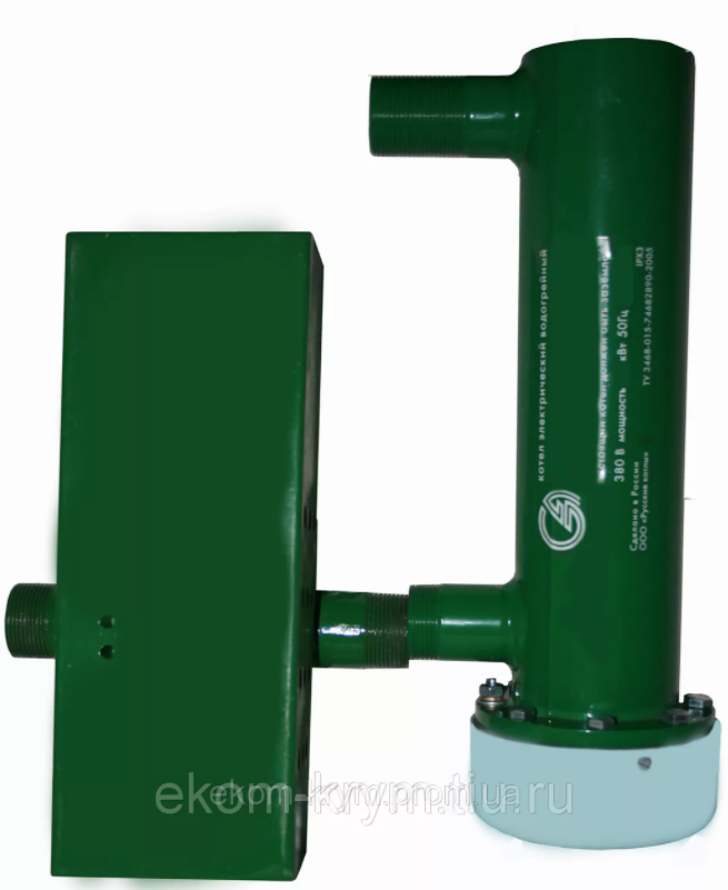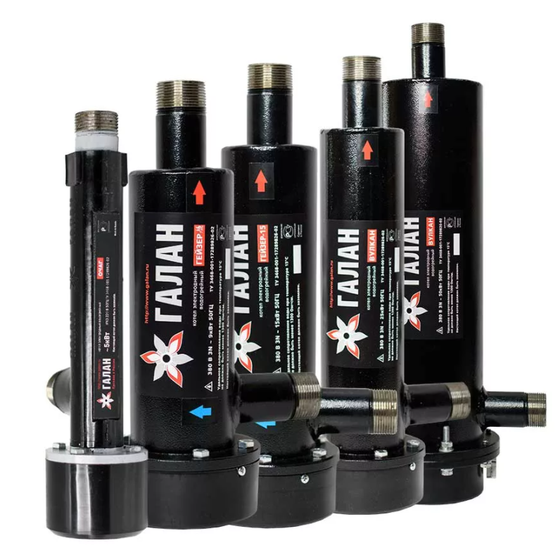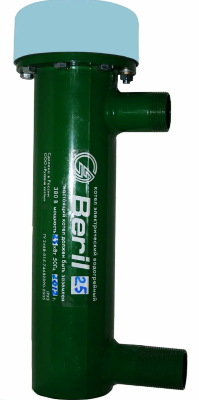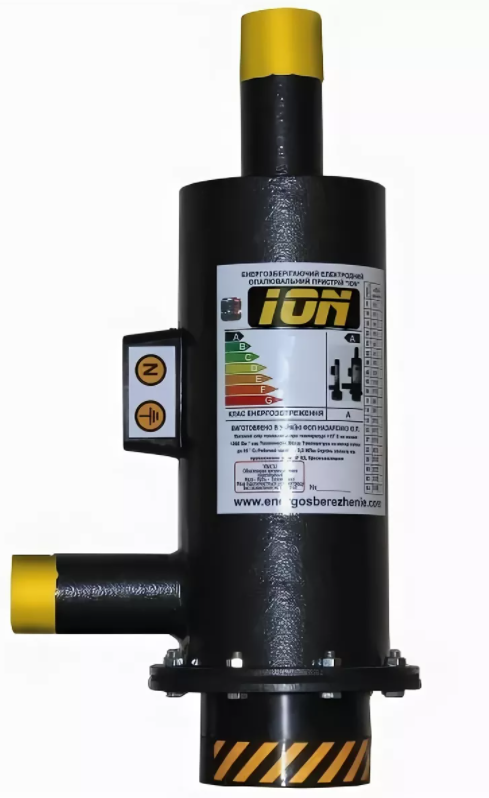 Внутри цилиндрического корпуса, не соприкасаясь с его стенками, расположен электрод. Он один, если прибор работает от электросети напряжением 220 В, или три, если это промышленный образец, которому требуется трехфазное подключение 380 В. Эти отличия указывают на разную мощность. Эффективность зависит от количества потребляемой энергии. Прибор с трёхфазным подключением отапливает площадь около 1000 квадратных метров.