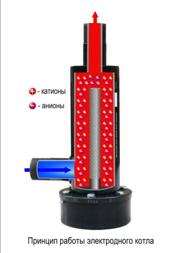 Носитель тепла, который циркулирует по трубам и попадает в рабочую емкость котла, контактирует непосредственно с электрическим током. Заряженные разными знаками ионы начинают хаотически и соударяясь двигаться. Благодаря образующемуся сопротивлению происходит разогрев теплоносителя.