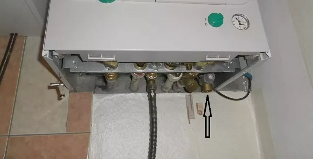 Теперь нужно поставить на место фильтр и сливную пробку. Заполняем систему водой, открыв краны. Запитайте котел до нужного давления вентилем снизу котла. Если из фильтра или слива подтекает вода, то желательно заменить резиновые прокладки. Если же их нет под рукой, то можно под них намотать ленту ФУМ.
