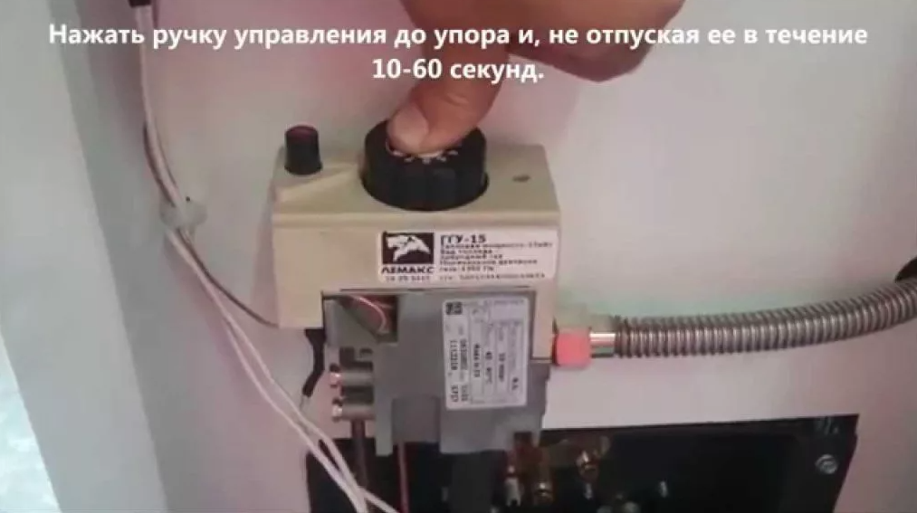 - Нажать на нее до упора и удерживать до тех пор, пока не загорится горелка. Обычно достаточно 10-60 секунд.