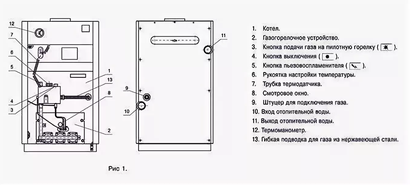 В зависимости от модели теплообменник может быть выполнен из медных трубок или чугуна. Газогорелочное устройство располагается в проеме топочной камеры и используется для включения котла. Терморегулятор задает температурный режим и поддерживает его. Устанавливается на передней панели. Для простоты управления регулятор оснащается делениями. Газоотводящий патрубок отвечает за выведение продуктов сгорания, располагается в верхней части агрегата. Подключение котла к системе отопления и водоснабжения происходит через резьбовые патрубки, располагающиеся на задней части корпуса.