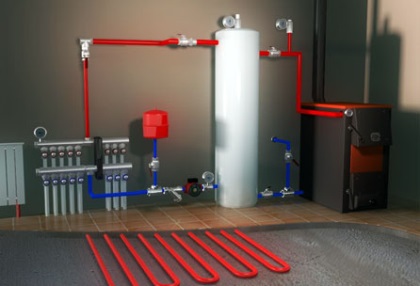 В зданиях большой этажности при наличии протяженных обогревательных контуров теплых полов, самотечная система не справится с большими объемами прокачки теплового носителя и высокими гидравлическими сопротивлениями линии. В этих случаях для обеспечения движения потока жидкости по длинному трубопроводу в магистраль добавляют циркуляционный электронасос (для теплых полов ставят еще один дополнительный агрегат), контур закрывают и вместо открытого накопительного бачка монтируют герметичный гидроаккумулятор.