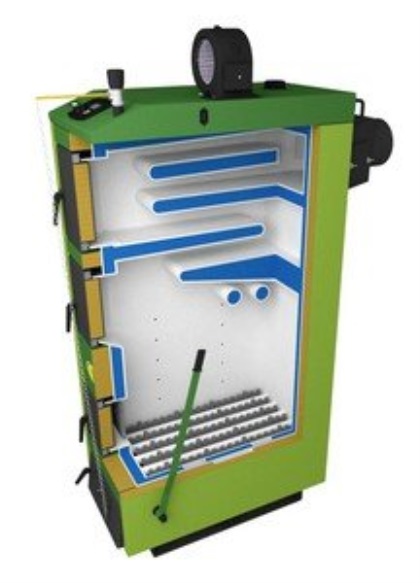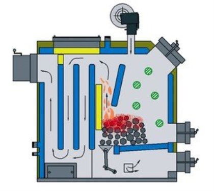 В отопительной установке реализован классический способ сжигания твердых видов топлива с прямой передачей тепла стенкам водяной рубашки и своду, являющемуся днищем котлового бака. В этот бак погружен жаротрубный теплообменник, отбирающий теплоту дымовых газов. Подогретый в канале воздух подается в топку снизу, через колосниковую решетку. Длительность горения обеспечивается за счет: