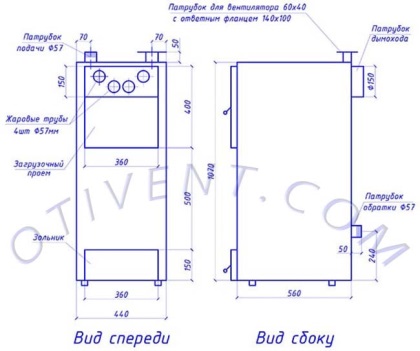 Устройство и габаритные размеры дровяного котла длительного горения для изготовления своими руками показаны на чертеже: