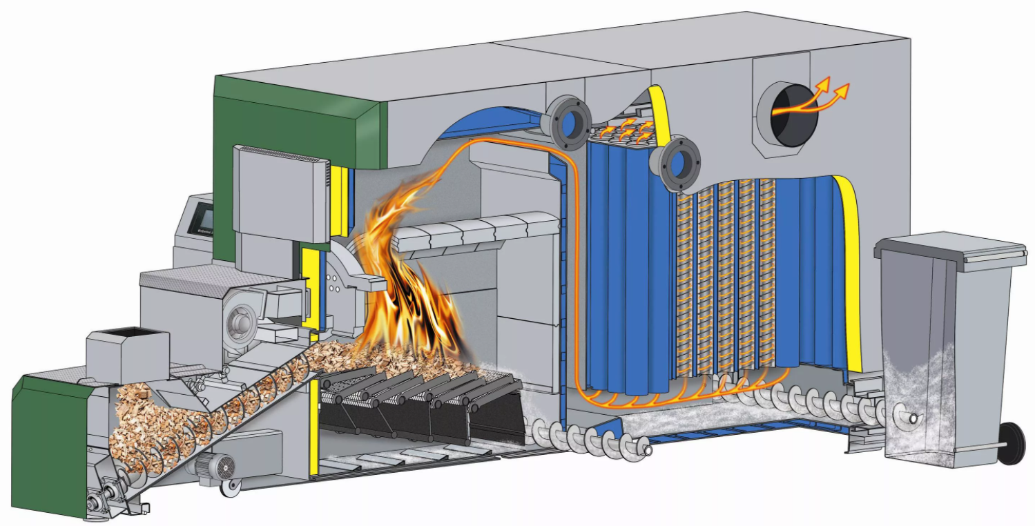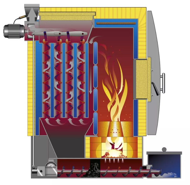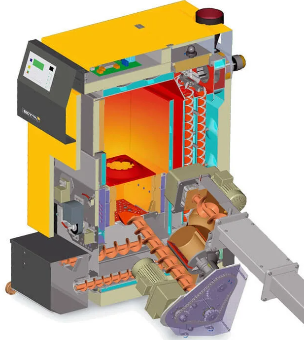 Внутри котла может быть размещен механизм самоочищения от сажи и движущиеся колосники. По мере накопления сажи и золы агрегат автоматически сбрасывает их и шнеками отправляет в накопитель. Такая конструкция обеспечивает высокую температуру сгорания опилок и щепы, обеспечивая полное их сжигание практически без «недогара». Высокий уровень автоматизации котлов с применением лямбда-зонда позволяет плавно управлять выдаваемой мощностью от 30% до 100% номинала и достигать КПД 92%.