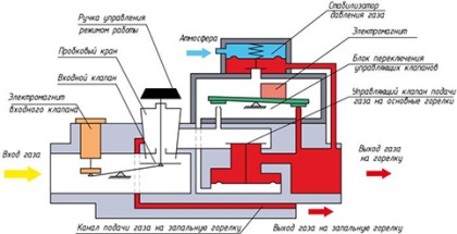 Контрольная система пускает пламя на основную горелку, если огонь присутствует также на пилотной. Прекращает подачу топлива при отсутствии или сильном снижении тяги в дымоходе. Автоматическая схема регулирования дает максимальную безопасность при подаче газа к котлам и другим подобным устройствам.