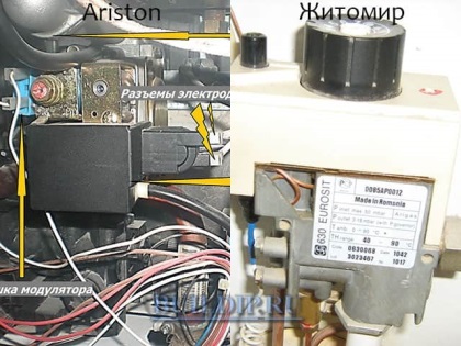 Газовый клапан отвечает за подачу топлива к обеим горелкам, а также перекрывает газ в аварийных ситуациях. Снизу электромагнитный клапан управляется термопарой и датчиком тяги, а сверху напор регулируется термостатом типа баллон – сильфон.