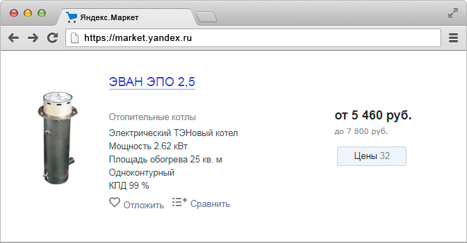 Самая бюджетная серия – котлы ЭВАН ЭПО. Стартовая модель имеет мощность 2,6 кВт и цену от 5460 рублей (сентябрь 2017). Обогреть такой котел сможет небольшое помещение в 25 м2.