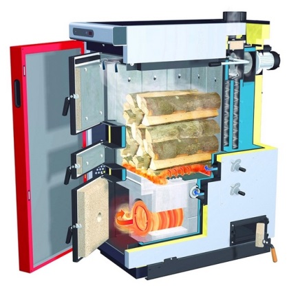 Более мощные котлы комплектуются вентилятором-дымососом, который устанавливается на верхней стенке корпуса на выходе дымоходного канала. При этом исключается появление обратной тяги и дверцу камеры газификации можно без последствий открывать даже в процессе горения.