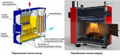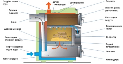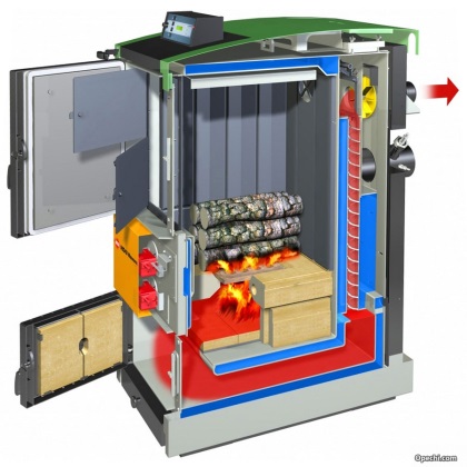1. Из первичной камеры. Она напоминает топку обычного котла, в которую загружается топливо. В зависимости от конструкции горение может происходить как внизу топливной камеры, так и сверху вниз.