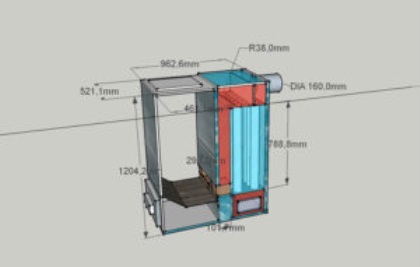 1. Разметка деталей первичной и вторичной камеры. Размер вторичной камеры подбираем, чтобы шамотный кирпич укладывался без подрезок. Дно первичной камеры сужается и завершается щелевой форсункой для горения газов.