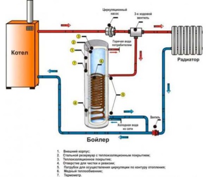 Его особенность состоит в том, что принцип действия основан не на нагреве воды за счёт собственного блока, а теплообмена от внешних источников, таких как сжигание топлива, электрической резистентности (сопротивления), контакт с центральным отоплением, использования солнечных батарей для переработки энергии. По своей сути бойлер является связующим звеном между сердцем системы отоплением (котлом) и всеми её сосудами и артериями, правильно распределяя нагрузку и напор на каждую ветвь. В данном распределителе горячая жидкость проходит сквозь металлическую спираль (змеевик), встроенную в накопитель. Теплообмен проходит с помощью теплопроводности между змеевиком и резервуаром с холодной водой. Обязательной составной частью бойлера является теплоизоляция, напоминающая по структуре термос для поддержания температуры внутри ёмкости, исключая потерю аккумулированных джоулей за пределы аппарата. Материалом для теплозащиты в основном становится полиуретан. В схему бойлера также встроены защитный анод, ревизионное отверстие, отбойник, погружная гильза (для датчика температуры).