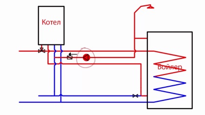 Если насос есть и в котле, и в бойлере, сразу за циркуляционным насосом должен быть смонтирован трехходовой клапан, один канал его подсоединяют к патрубку водонагревателя. Так обеспечивается нормальная работа отопления. На возвратную трубу до точки вступления в котел должен быть установлен тройник. А уже в этот тройник подсоединяют патрубок, оттягивающий жидкость из теплообменника. Подобная простая система легко и изящно решает поставленные задачи.