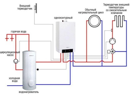 У всех современных моделей одноконтурных котлов в составе деталей, помимо патрубка входа-выхода воды, предусмотрены патрубки для подключения к внешним агрегатам водонагрева. Таким образом, реализуется возможность синтеза одноконтурного котла с бойлером косвенного нагрева для создания многофункциональной системы отопления и горячего водоснабжения дома.