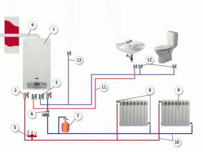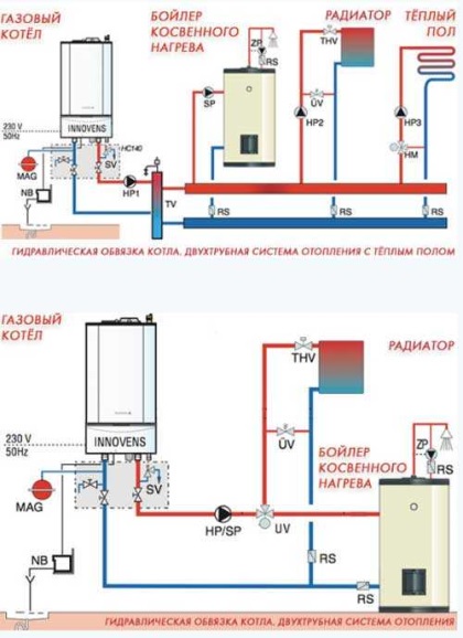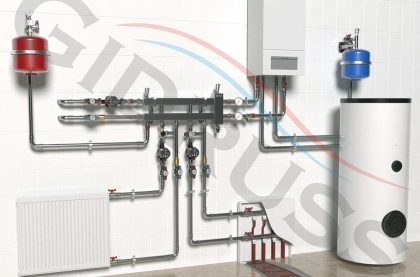 Для справки. Для тех, кто планирует нагревать в котельной воду для ГВС, сообщаем, что разводка системы отопления от двухконтурного газового котла выполняется так же, как и с простым одноконтурным теплогенератором. Добавляются только трубы в обвязке, идущие к потребителям горячей воды.