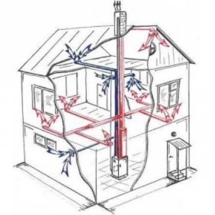 Здесь важна правильная разводка отопления от котла, иначе схема не будет нормально функционировать. В связи с тем, что давление в сети трубопроводов небольшое, естественная циркуляция может хорошо работать в одно – и двухэтажных домах общей площадью до 250 м2. В более внушительных зданиях устраивать подобные системы не рекомендуется.