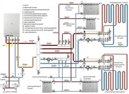 Схематичное представление разводки отопления в двухэтажном доме большой площади. Двухтрубная попутная и тупиковая система и теплый пол, подключенные через коллекторы. Исключение конфликта циркуляционных насосов с помощью гидрострелки: