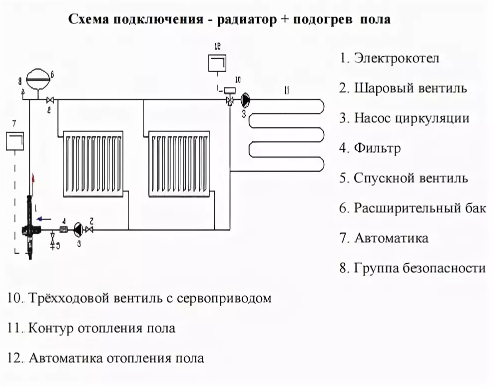 Классический вариант обвязки электрокотла включает в себя следующие элементы: