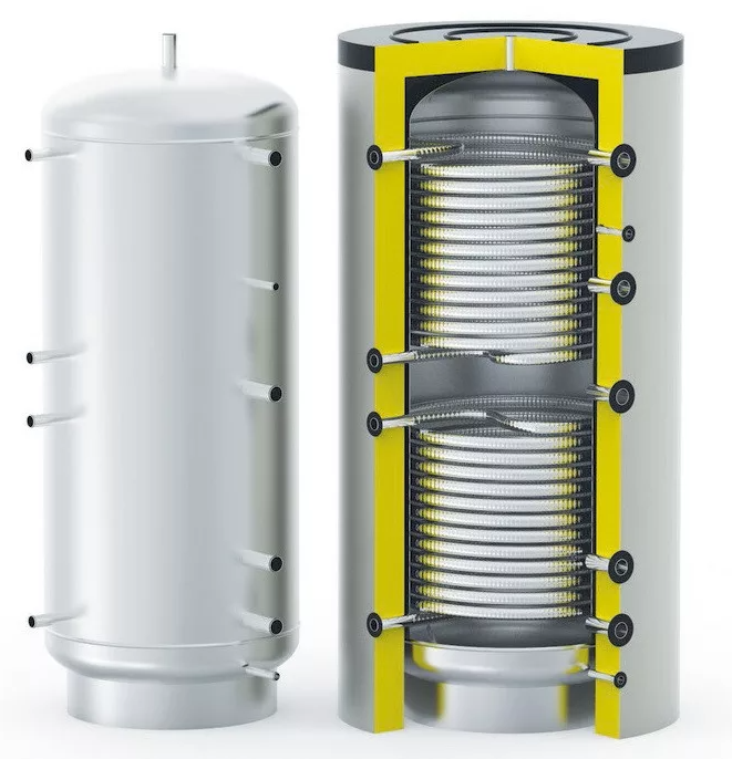 - Дополнительные функции — в устройстве некоторых баков присутствует змеевик ГВС. Происходит одновременное аккумулирование нагретого теплоносителя и нагрев горячей воды. Установкой можно удовлетворить потребности в ГВС жильцов дома, использующих одноконтурные твердотопливные или электрические котлы, не предназначенные для обеспечения горячего водоснабжения.