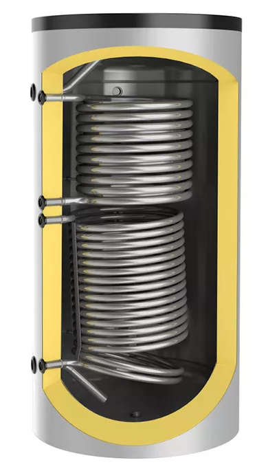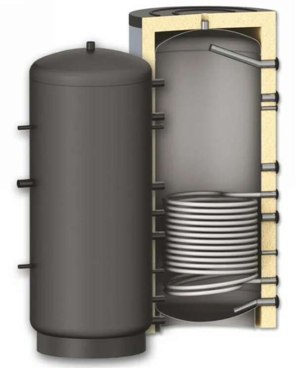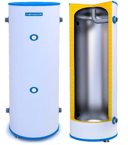 Фактически, это бак с встроенным змеевиком ГВС и теплоизоляционным кожухом. Предназначение емкости аккумулировать излишки тепловой энергии. После отключения основного источника нагрева теплоносителя, бак на определенное время заменяет его.
