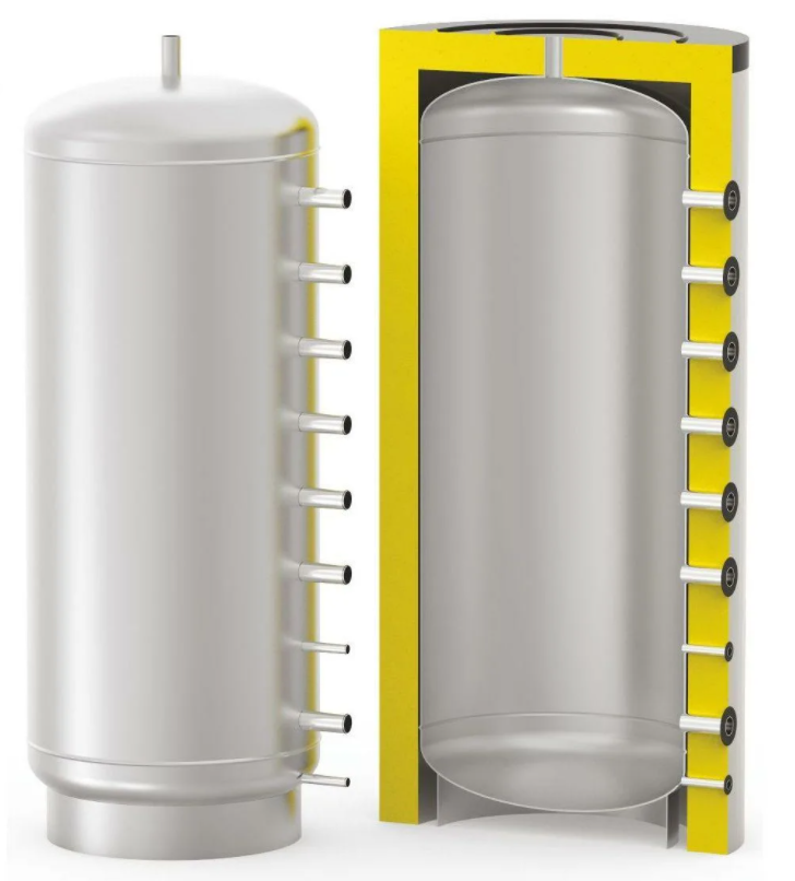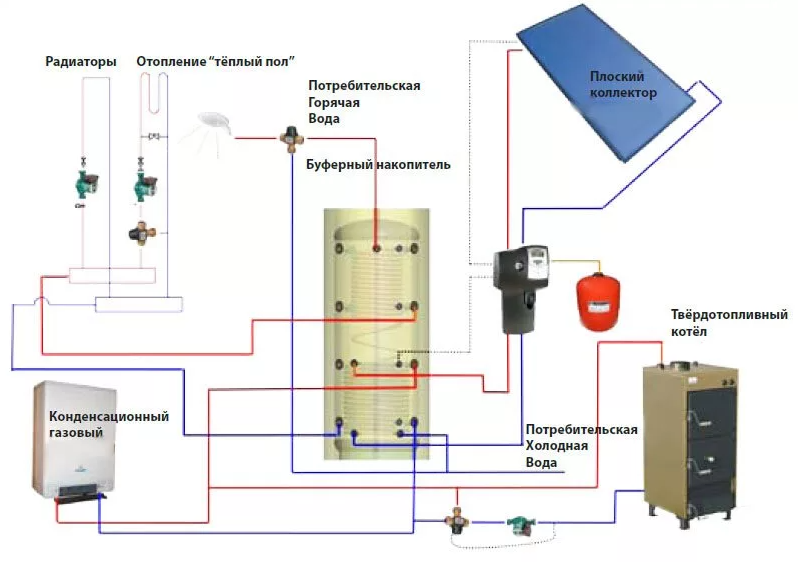 - Многовалентные системы отопления — бак применяется как гидравлический разделитель контуров систем обогрева, работающих от нескольких источников энергии: твердотопливных, газовых и электрических котлов, тепловых насосов подключенных друг к другу.