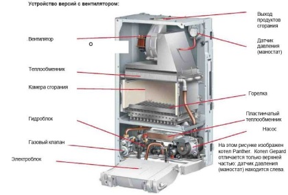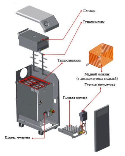 Большинство моделей газовых теплогенераторов помимо схожего принципа работы имеет в своём составе одинаковые элементы. Рассмотрим оснащение такого теплогенератора.