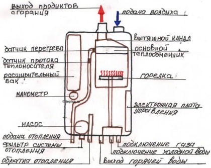 Важно! Устройство газового котла подразумевает под собой обогрев отопительной системы и системы водоснабжения с безопасным извлечением продуктов горения.