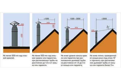 - Высота оголовка трубы рассчитывается, в зависимости удаления от конька кровли. Оптимально, установить дымоход по центру кровли, подняв его на 0,5 м.