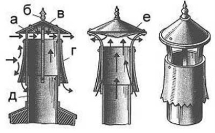 | ЦАГИ | Конструкция, разработанная Центральным аэрогидродинамическим институтом. Представляет из себя металлическую трубу с экранирующим цилиндром и защитным конусом внутри. Исключает задувания с боков и сверху, защищает от мусора и атмосферных осадков. Но при сильных морозах (ниже минус 15-18°C) может способствовать образованию наледи. | |